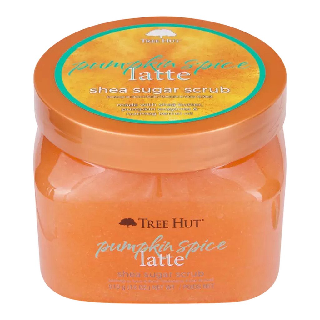 Tree Hut Pumpkin Spice Latte Shea Sugar Scrub é livre de parabenos, vegano, sem sulfatos, sem álcool, não contém doadores de formaldeído, tem fórmula antiderrapante e com longa duração
